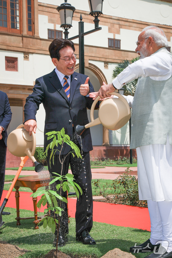 인도를 국빈 방문 중인 이재명 대통령이 20일 뉴델리 영빈관 조경공간에서 나렌드라 모디 인도 총리와 아소카 나무를 공동식수하고 있다. 2026.4.20 © 뉴스1 이재명 기자