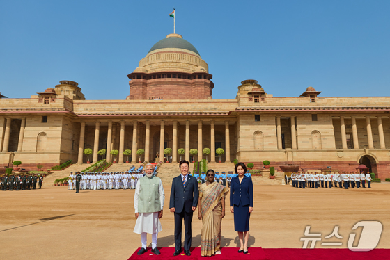 이재명 대통령과 김혜경 여사가 20일 뉴델리 대통령궁 광장에서 열린 공식환영식에서 드라우파디 무르무 인도 대통령, 나렌드라 모디 인도 총리와 기념촬영을 하고 있다. (공동취재) 2026.4.20 © 뉴스1 이재명 기자