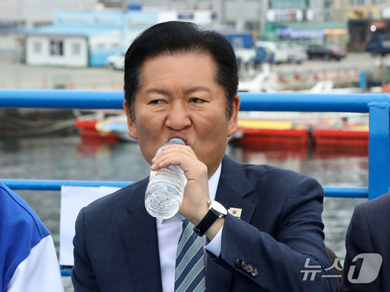 정청래 더불어민주당 대표가 22일 경남 통영 욕지도에서 통영시로 향하는 선박 위에서 열린 '욕지도 선상 최고위원회의'에 참석해 물을 마시고 있다. 2026.4.22 © 뉴스1 윤일지 기자