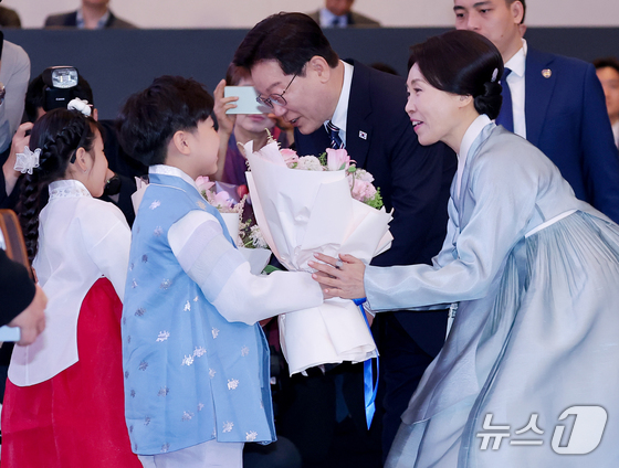 베트남을 국빈 방문 중인 이재명 대통령과 김혜경 여사가 22일(현지시간) 하노이의 한 호텔에서 열린 동포 오찬 간담회에서 화동에게 꽃다발을 받고 있다. 2026.4.22 © 뉴스1 이재명 기자