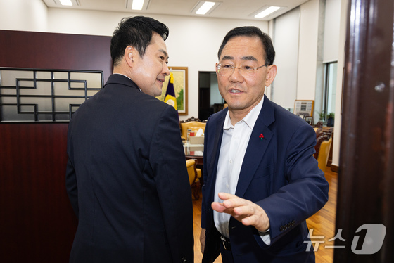 대구시장 경선에서 컷오프(공천배제)된 주호영 국회부의장과 장동혁 국민의힘 대표가 31일 서울 여의도 국회에서 면담을 위해 부의장실로 들어서고 있다. 2026.3.31 © 뉴스1 유승관 기자