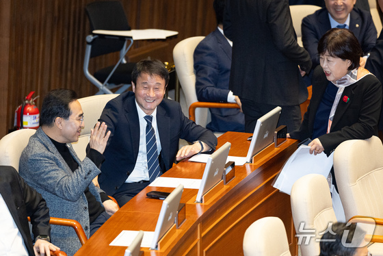 지난 1월 서울 여의도 국회에서 열린 더불어민주당 원내대표 선출을 위한 의원총회에서 한병도 의원이 꽃다발을 들고 있다. 왼쪽부터 진성준 의원, 한 의원, 백혜련, 박정 의원. 2026.1.11 © 뉴스1 유승관 기자