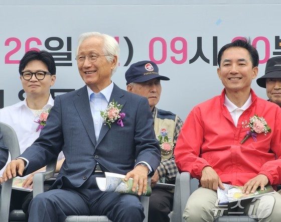 26일 부산 북구 구포초등학교 총동문 체육대회에 박민식 전 장관(오른쪽)과 한동훈 전 대표가 행사장에 참석해 자리하고 있다. 2026.4.26 © 뉴스1 임순택 기자