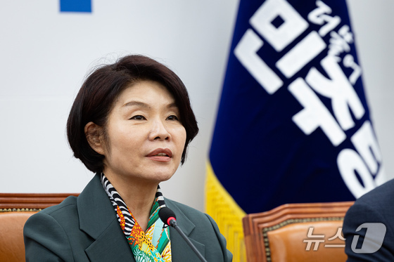 한정애 더불어민주당 정책위의장이 28일 서울 여의도 국회에서 열린 원내대책회의에서 모두 발언을 하고 있다. 2026.4.28 © 뉴스1 유승관 기자