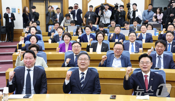 최태원 대한상공회의소 회장이 28일 서울 여의도 국회 의원회관에서 열린 한중의원연맹 제1회 정책세미나에서 참석자들과 기념 촬영을 하고 있다. 2026.4.28 © 뉴스1 신웅수 기자
