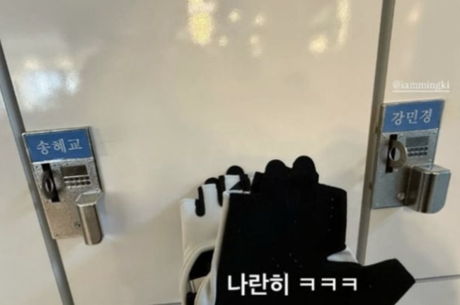 공개된 사진에는 송혜교와 강민경의 이름이 나란히 적힌 사물함, 그리고 강민경이 선물한 듯한 운동용 장갑 한 쌍이 담겨 있다.