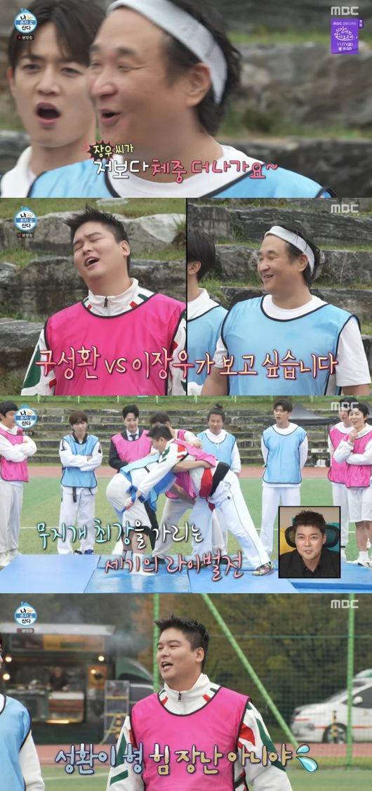 이날 세 번째 스페셜 매치로 씨름 대결이 펼쳐졌다. 이장우는 “성환이 형 있는데 어떻게 이기냐”라고 했고, 구성환은 “저보다 체중이 더 나간다”라고 몸무게를 언급했다.