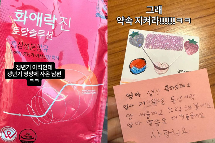 이지혜가 받은 선물은 홍삼성분이 함유된 갱년기 여성건강 특허 제품으로, 그는 "건강하라고 사 온 건 알겠는데 저 단어 많이 눈에 띈다"고 밝혔다. 자신이 갱년기가 아니라고 선을 그은 그는 "갱년기 아직인데 갱년기 영양제 사 온 남편"이라고 강조했다.