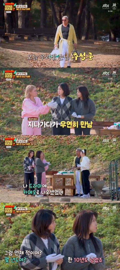 이때 김성령이 "지원이랑은 봤지?"라는 질문을 던졌다. 하지원이 "내 드라마에 카메오로 나왔었어"라며 지난 2015년 방영한 '너를 사랑한 시간'을 언급했다. 당시 하지원의 상상 속 이상형인 '상남자'로 추성훈이 연기했던 것. 김성령이 "그게 언제 적이야?"라고 묻자, 하지원이 "한 10년도 넘었다"라며 추억을 회상했다.