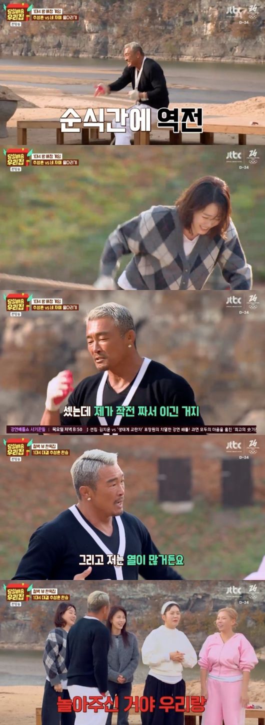장영란이 준비한 16첩 반상으로 즐거운 식사를 즐긴 이들은 방 배정을 위한 게임을 진행했다. 첫 번째 게임은 1 대 4 줄다리기. 추성훈은 “힘써도 되냐. 그럼 조심해야 한다”라며 자신감을 드러냈다.