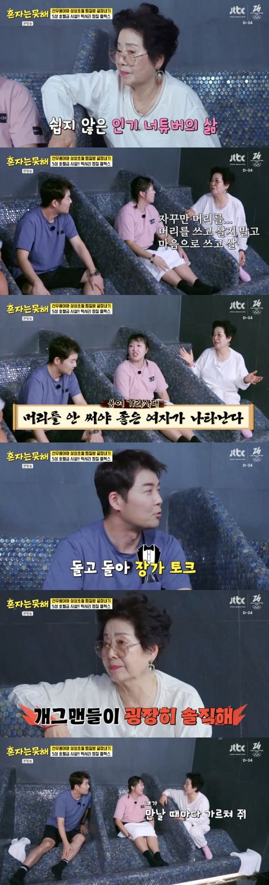 13일 첫 방송된 JTBC ‘혼자는 못 해’에서는 선우용여가 찜질방 투어에 나선 모습이 그려졌다.