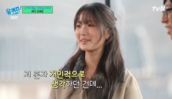 14일 방송된 tvN '유 퀴즈 온 더 블럭'(유 퀴즈)에서는 드라마 '오늘부터 인간입니다만'으로 돌아온 김혜윤이 출연해 유재석과 만나 얘기를 나눴다.