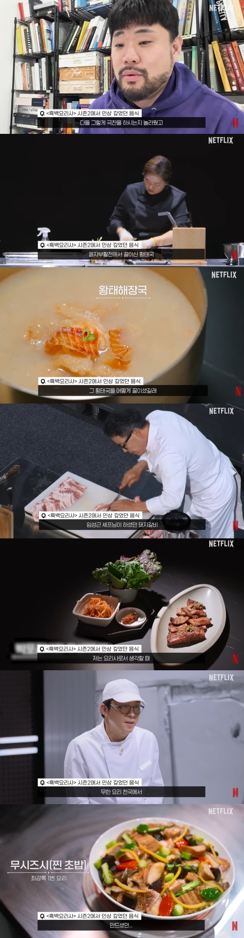 "시즌2에서 인상 깊었던 음식은 뭔가?"라는 질문에 "첫 번째는 윤주모 님이 패자부활전에서 끓이신 황태국이다. 그 황태국을 어떻게 끓이셨길래 다들 그렇게 극찬하시는지 놀랐다. 다음은 윤주모 님과 임짱 님, 임성근 셰프님이 하셨던 돼지갈비. 현장에서 1시간 만에 엄청 빨리 끝내셨다. 요리사로서 생각할 때 우리가 흔히 아는 익숙한 음식을 더 맜있게 하는 게 힘들것 같다. 그걸 1등 하는 걸 보면서 '와 정말 대단하다. 먹어보고 싶다'는 생각이 들었다. 무한요리천국에서 최강록 셰프님이 3시간을 다 쓰셔서 만들었던 찐 초밥, 그것도 정말 먹어보고 싶었다"고 답했다.