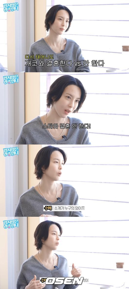 이에 이지혜는 "스타와 결혼한다 안 한다"라고 다시 물었고, 김수미는 "저는 스타와 결혼 안 한다"고 단호하게 말했다.