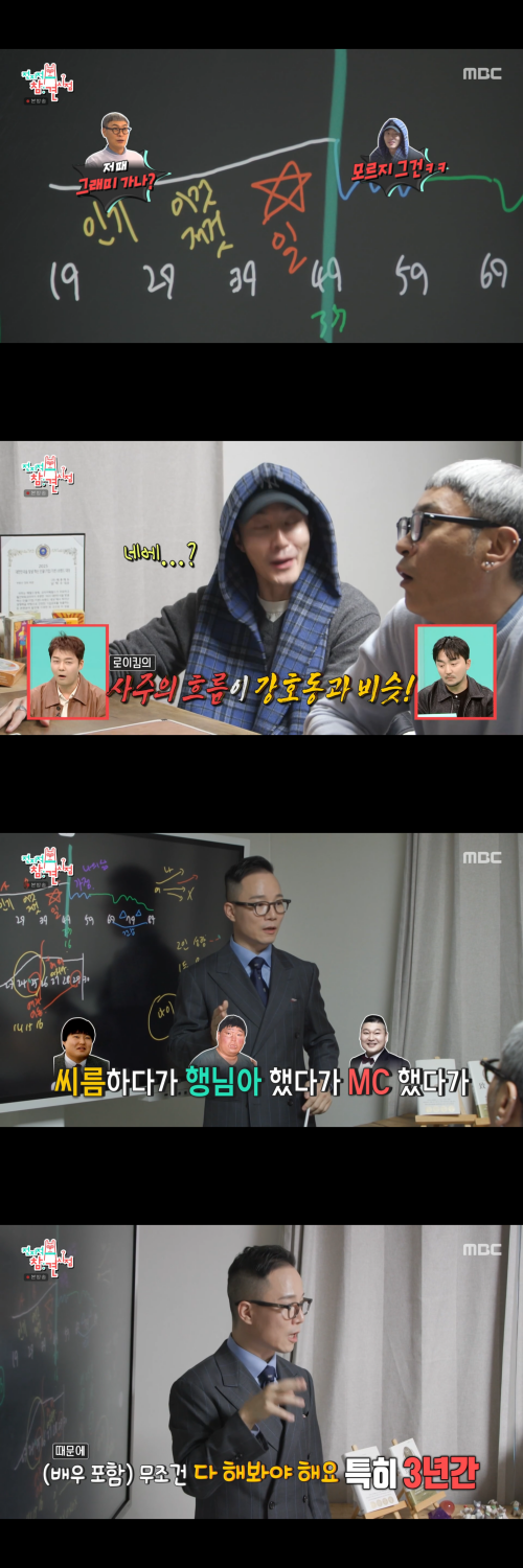 이에 로이킴은 “제가 여러 가지를 하다 보니까 사람들이 왜 배우는 안 하냐고 묻는다”며 “사실 연기는 자신이 없다”고 솔직하게 털어놨다. 하지만 남택수는 “강호동 씨와 사주 구조가 비슷하다. 씨름선수에서 방송인, MC로 계속 업종이 바뀌었다”며 “이런 사주는 하나만 고집하지 말고 다 해봐야 한다”고 조언했다. 이어 “특히 앞으로 3년은 다양한 시도를 해보는 게 좋다”며 “망가지는 콘셉트도 잘 어울린다”고 덧붙였다.
