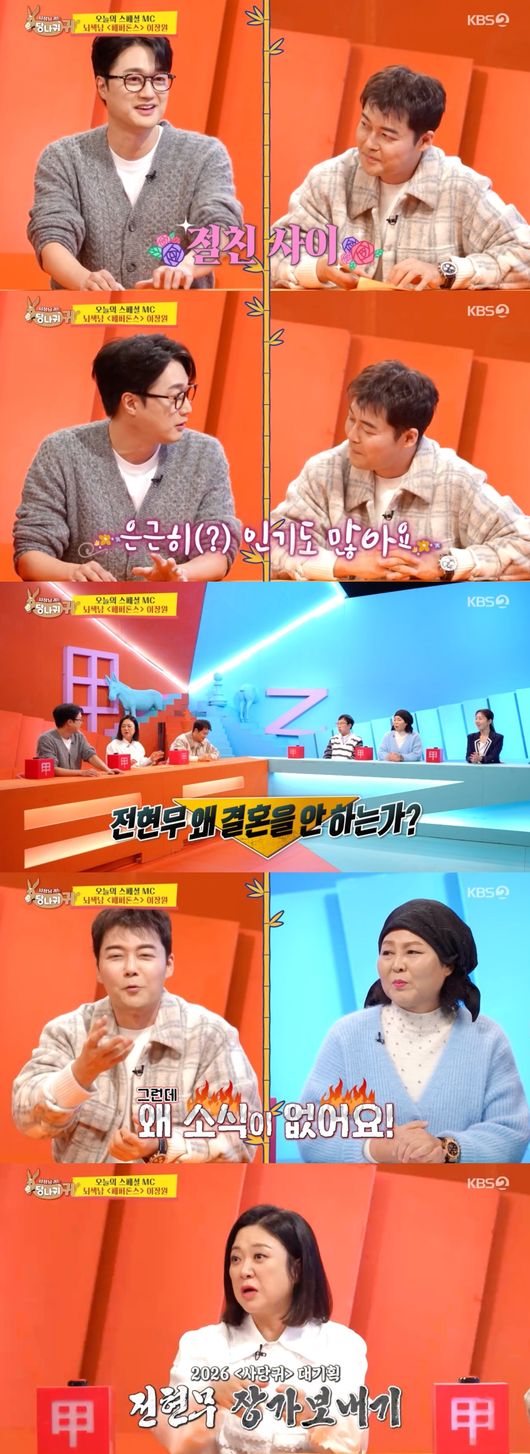 이장원의 등장에 또 다른 '사당귀' MC 김숙은 전현무와의 친분을 강조하며, 이장원에게 "전현무 씨 도대체 왜 결혼 안 하는 것 같냐"라고 물었다. 이장원은 "은근히 인기 많다. 그런데 일이랑 사랑하는 것 같다"라며 절친한 친구로서 전현무의 미혼 이유를 밝혔다.