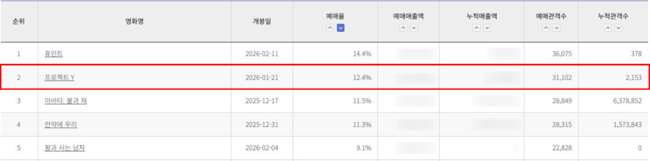 [OSEN=연휘선 기자] 영화 '프로젝트 Y'가 1월 개봉작 중 예매율 1위에 오르며 뜨거운 기대감을 입증했다.