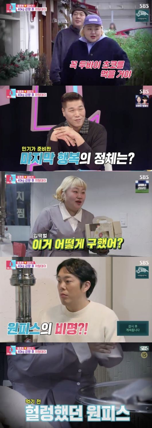 결국 체중 감량에 성공한 홍윤화는 손꼽아 기다리던 치팅데이를 하러 갔다. 홍윤화는 단골로 다니던 흑돼지 식당으로 향했다. 홍윤화는 김민기에게 받은 금팔찌를 자랑했고, 김민기는 “마누라 빼고 다 팔았다”라고 너스레를 떨었다.