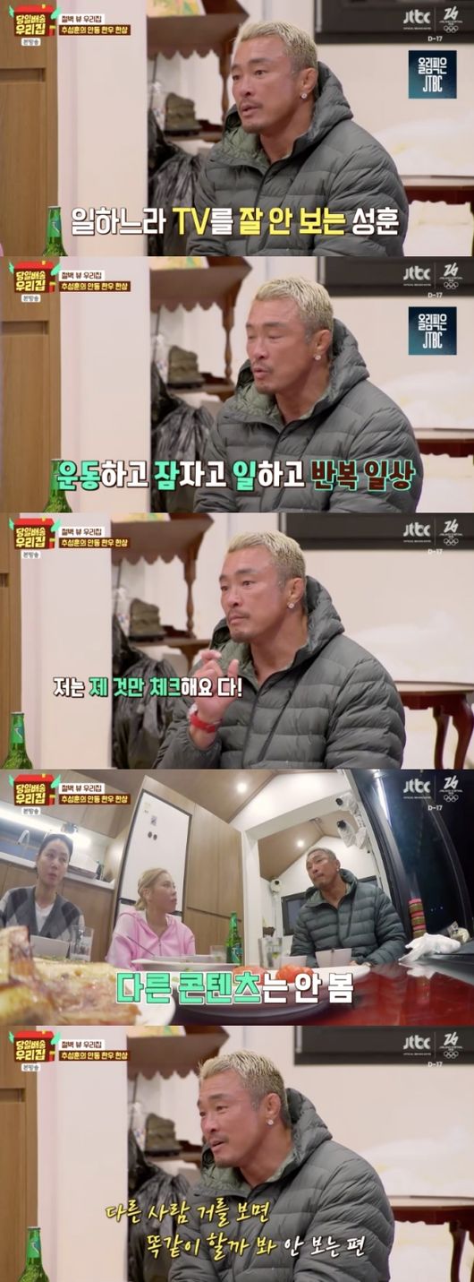 추성훈은 “연예인 잘 모른다. 일 때문에 바빠 예능도 잘 안 본다. 운동하고 잠자고 일하고 이런 시간밖에 없다. 저는 제 것만 체크한다. 다른 콘텐츠는 안 본다. 의미 없다고 본다. 다른 사람 것을 보면 똑같이 할까봐. 그건 재미없다”라고 말했다.