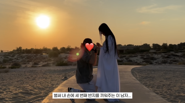 영상에서 남편은 노을이 지는 사막에서 한쪽 무릎을 꿇고 퓨어디에게 세 번째 프러포즈를 했다. 퓨어디는 “벌써 세 번째 반지를 끼워주는 남편. 남편한테 늘 고맙고 많이 사랑해요”라고 했다.