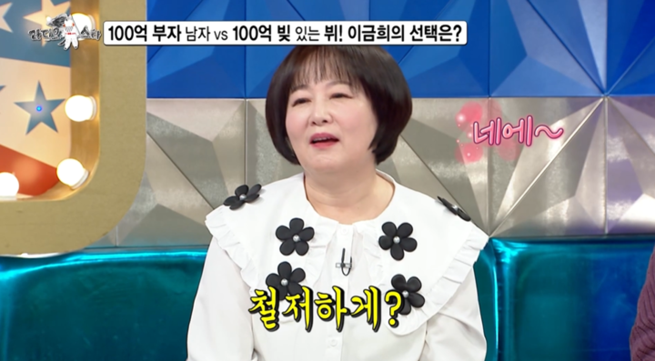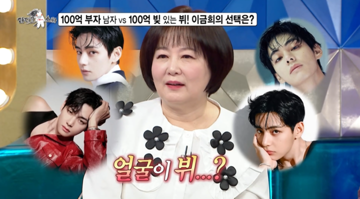 이어진 밸런스 게임에서 이금희의 팬심은 더욱 폭발한다. 장도연이 “100억 자산이 있는 평범한 남자 vs 100억 빚이 있는 잘생긴 남자” 중 하나를 고르라고 하자 이금희는 “100억은 제가 못 갚을 것 같다”며 현실적인 답을 내놨다. 그러자 장도연은 “100억 빚이 있는데, 뷔 씨랑 똑같이 생겼다”는 조건을 추가했다. 이금희는 “그분이 저를 좋다고 하냐”고 되묻더니 “죽어라 일하겠다”고 선언해 웃음을 자아냈다.