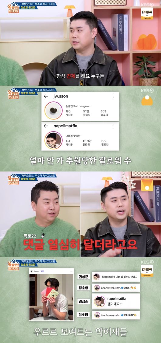 22일 방송된 KBS 2TV 예능 ‘옥탑방의 문제아들’에서는 시즌2 TOP4에 오른 정호영 셰프와 시즌1 우승자 권성준 셰프가 출연했다.