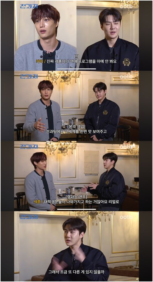 세훈은 “요새 연애 프로그램 엄청 보지 않냐. 나는 아예 안 본다”라며 스몰 톡을 했다. 이에 카이는 “환승연애4 이거 요즘 논란이잖아. 그거 맞아? 메기 두 명 나왔잖아. 나 메기 나올 때 상처 받았어”라며 신난 듯 말해 세훈과 전혀 다른 성향을 보였다.