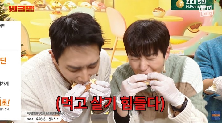 그러나 도넛을 과다 섭취한 딘딘은 "아 이제 그만 먹고 싶다. 짬뽕 국물이라도 넣어줘"라며 혈당스파이크로 고생하는 모습을 보였다. 이준도 방송을 마치고 "토할 것 같다"라며 힘들어 했다.