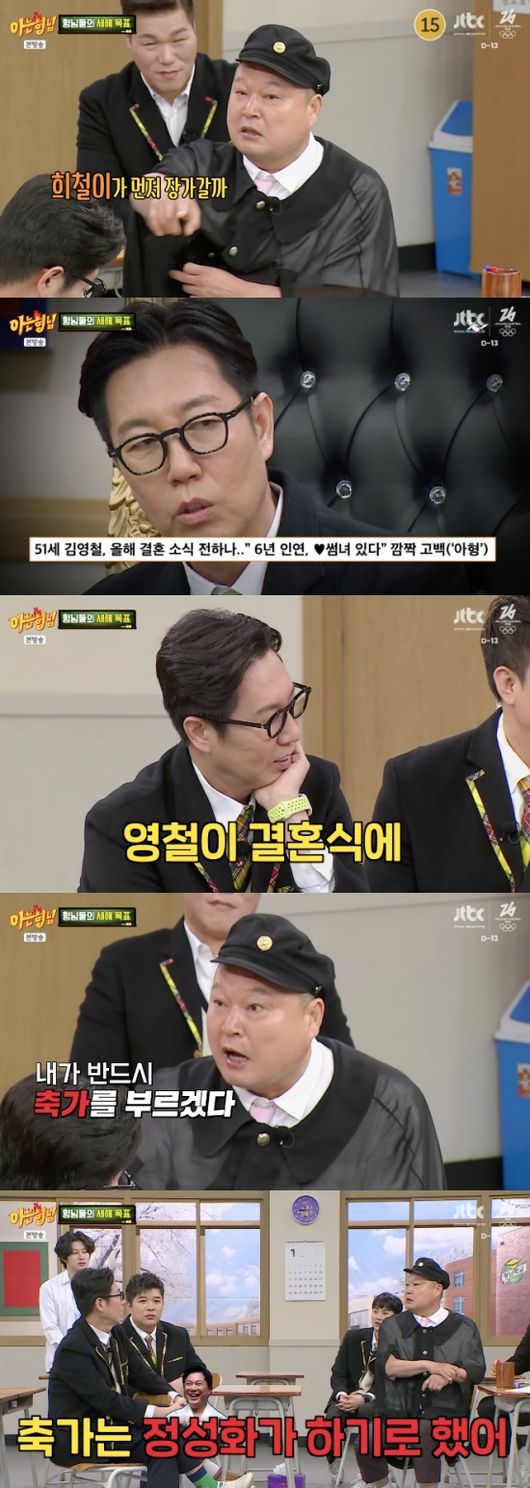 강호동은 새해 계획이 있냐는 질문에 “희철이가 먼저 장가갈까, 영철이가 먼저 장가갈까, 하면서 본인의 썸을 공개했다”라고 말문을 열었다. 앞선 방송에서 김영철은 썸 사실을 공개해 ‘아형’ 멤버들의 환호를 받았다.