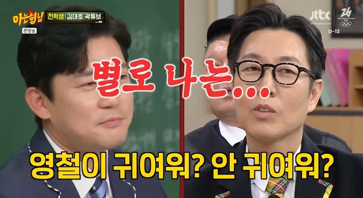 이어 강호동은 김대호에게 김영철도 귀엽냐고 물었다. 그러자 김대호는 "별로 나는"이라며 고개를 저어 웃음을 자아냈다.