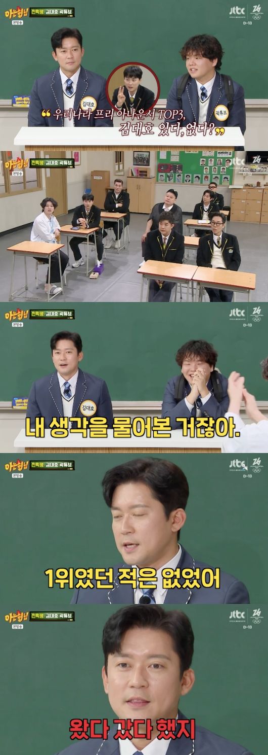 민경훈은 “우리나라 프리 (선언한) 아나운서 탑3 안에 (김대호가) 있냐”라고 물었고 김대호는 “종합적으로 보면 3위 안에 있다”라고 자신감 넘치게 답했다.