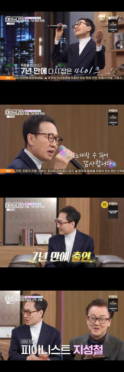 24일 방송된 MBN ‘김주하의 데이앤나잇’에는 유열이 게스트로 출연했다. 김주하가 “오랜만에 방송에 나오신 것 아니냐”고 묻자 유열은 “노래를 부르며 토크쇼에 출연하는 건 7년 만”이라며 “정말 오랜만에 시청자분들께 인사를 드리게 됐다”고 밝혔다.