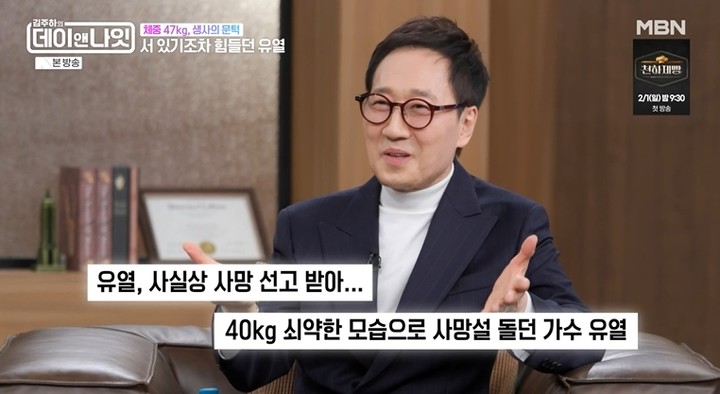 유열은 "요즘은 현대병처럼 많이 앓고 계시더라. 예전에 건강검진을 받았을 때 의심 소견을 받았다"라면서 "2019년에 폐렴을 앓았는데 검사 결과 폐섬유증이었다"라고 조심스럽게 털어놨다.