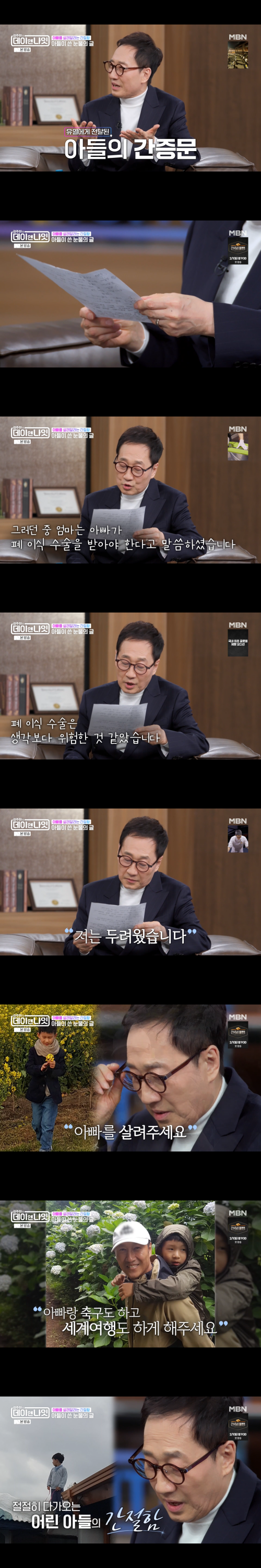 이어 아들은 “수술이 너무 위험해 보여 무서웠다”며 “그날부터 한 달 동안 엄마와 새벽 예배에 가서 ‘아빠를 살려주세요. 아빠랑 축구도 하고 세계 여행도 하게 해주세요’라고 매일 기도했다”고 적었다. 또 잠들기 전에도 엄마와 함께 “하나님, 아빠를 살려주세요”라고 기도했다는 대목이 공개되며 스튜디오는 숙연해졌다.