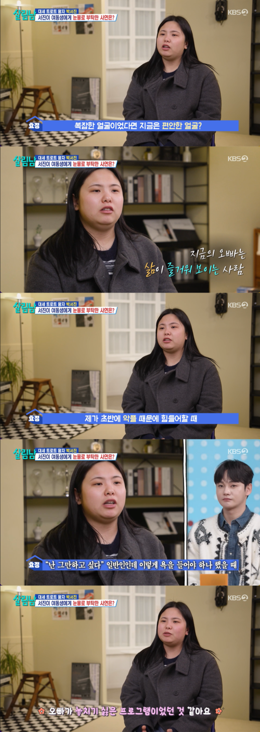 [OSEN=박근희 기자] '살림하는 남자들 시즌2’ 가수 박서진이 '살림하는 남자들' 출연 2주년을 맞이한 가운데, 동생 효정 씨가 과거 악플로 힘들었던 시기 오빠와 함께 울었던 일화를 공개했다.