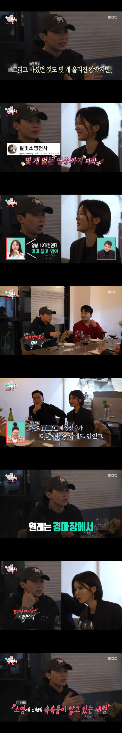 이어 박소영 아나운서의 개인 채널까지 구독하고 있다고 밝힌 양세형은 “원래 목포에 계셨다가 다른 방송사에서도 활동하셨고, 경마장 아나운서에도 지원하셨던 걸로 안다”며 구체적인 이력까지 언급했다. 이에 박소영은 “진짜 다 보셨다”며 놀라움을 드러냈다.