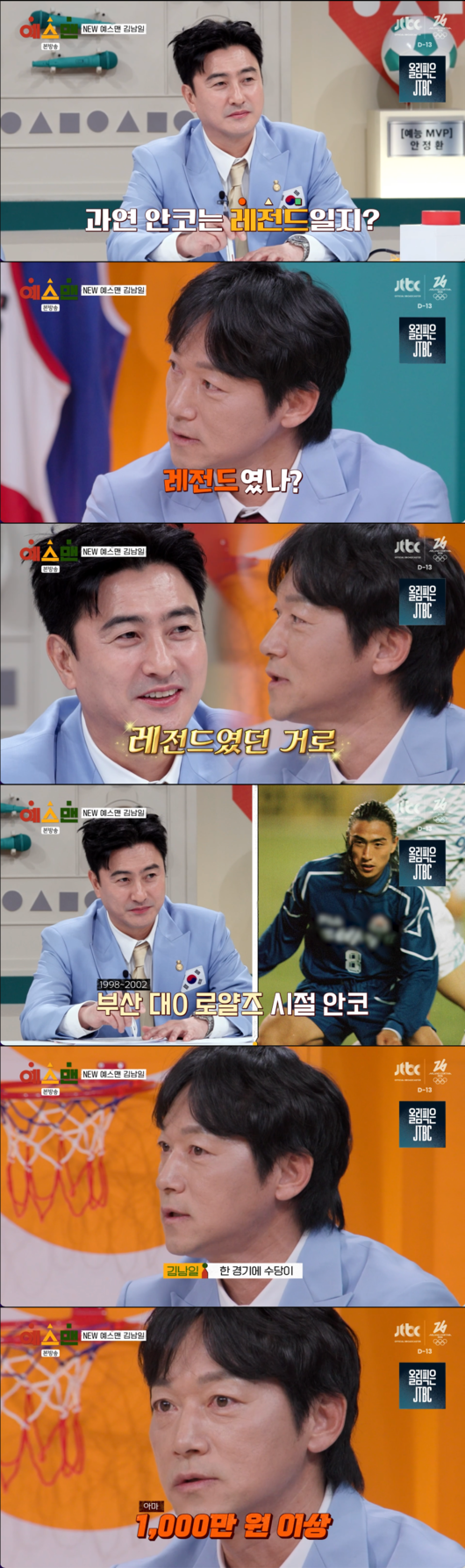 특히 김남일은 안정환도 레전드냐는 질문에 “정환이 형은 레전드였나?”라고 반문해 현장을 폭소케 한 뒤, 이내 “레전드였던 걸로 기억하고 있다”며 안정환의 남달랐던 재력을 공개했다.
