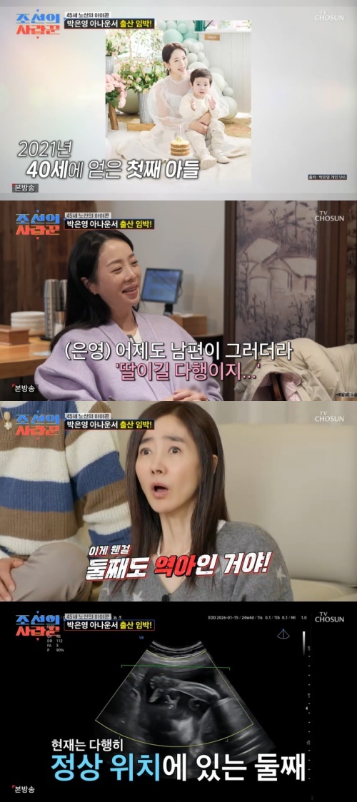 26일 오후 방송된 TV조선 예능 프로그램 '조선의 사랑꾼'에서는 올해 나이 45세 박은영 아나운서가 출산이 임박한 근황을 공개했다.