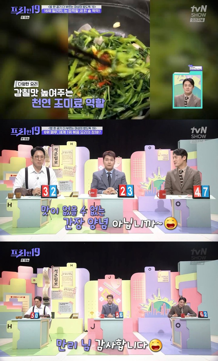 26일 방송된 tvN SHOW ‘프리한19’에서는 ‘밥 한 공기 더 부르는 마성의 밥도둑 19’를 주제로 아시아, 아메리카, 유럽, 중동, 아프리카를 아우르는 전 세계의 다채로운 요리들이 소개됐다.