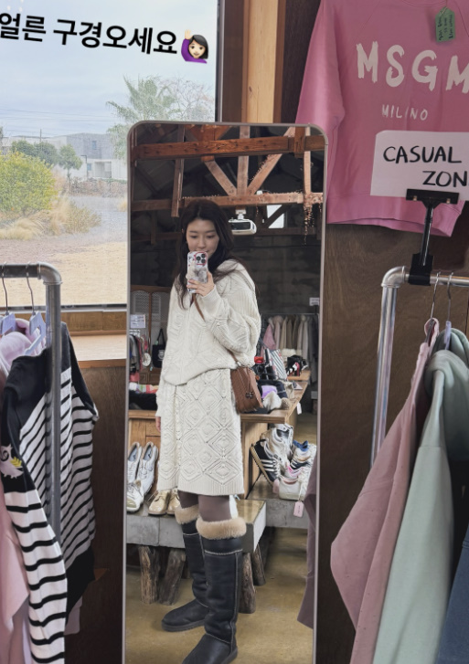거울 셀카 속 모습은 편안하면서도 포근한 니트 투피스에 롱부츠를 매치한 스타일로, 따뜻한 카페 분위기와 잘 어울리는 데일리 룩이 인상적이다. 매장 안에는 의류와 소품들이 진열돼 있고, 플리마켓 현장의 소소한 활기가 그대로 느껴진다.