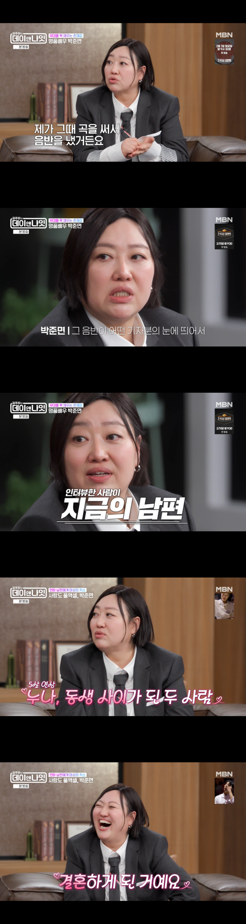 31일 방송된 MBN ‘김주하의 데이앤나잇’에는 박준면이 게스트로 출연해 자신의 연애와 결혼 이야기를 전했다. 이날 그는 현재 남편과의 첫 인연을 떠올리며 당시 상황을 차분하게 설명했다.