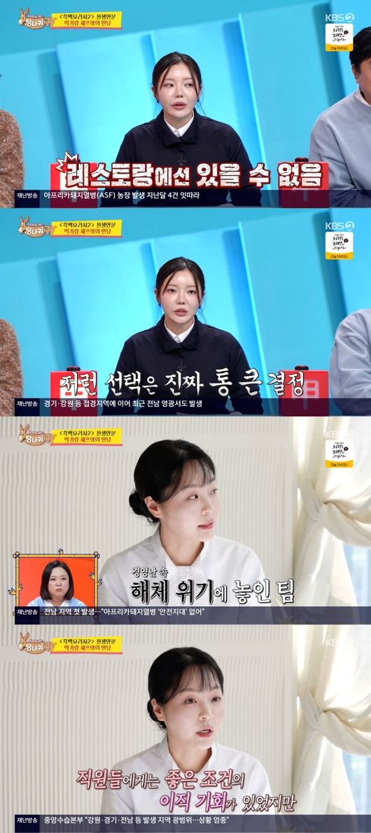 조서형은 “그걸 저희 직원들 앞에서 저걸 얘기하시면 어쩌나”라며, “아예 없는 경우다. 레스토랑은 운영 자체가 흑자였다가 적자였다하기 떄문에 저런 선택이 정말 쉽지 않다”라고 놀라워했다.