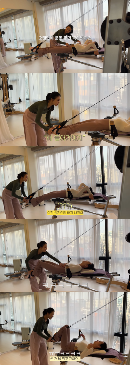 강사가 “밥 안 먹었죠 아직?”이라고 묻자, 윤승아는 결국 웃음을 터뜨리며 “밥 먹었죠”라고 솔직하게 고백했다. 이에 강사는 윤승아의 배를 잡고 기구를 늘리며 “배 들어가야 해, 무슨 자신감으로 핑크를 입고 왔어 그러면”이라고 거침없는 팩트 폭격을 날려 현장을 폭소케 했다.