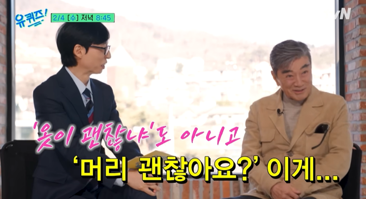 이덕화는 '유퀴즈' 섭외를 받자마자 가발 피팅부터 했다며 "이거 오늘 새로 한 거다"라고 신상 가발을 자랑했다. 유재석이 가발을 유심히 바라보자, 이덕화는 "괜찮아요?"라며 "옷 괜찮냐는 것도 아니고 머리 괜찮냐고 한다"며 웃음을 자아냈다. 이어 "세상에는 머리가 빠진 사람과 머리가 빠질 사람으로 두 종류가 있다"고 장난스럽게 말하며 현장을 웃음바다로 만들었다.