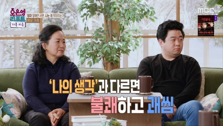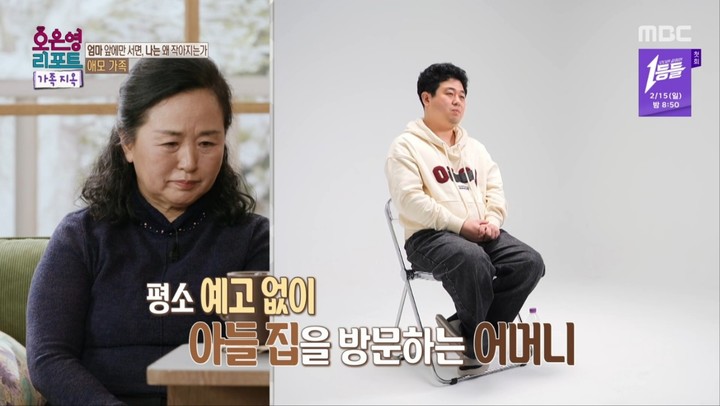 2일 방송된 MBC '오은영 리포트'는 '가족 지옥' 특집으로 진행됐다. 이날 '애모 가족'의 엄마 황숙자 씨와 아들 김병호 씨는 오랜 갈등을 해결하고자 오은영 박사를 찾았다.