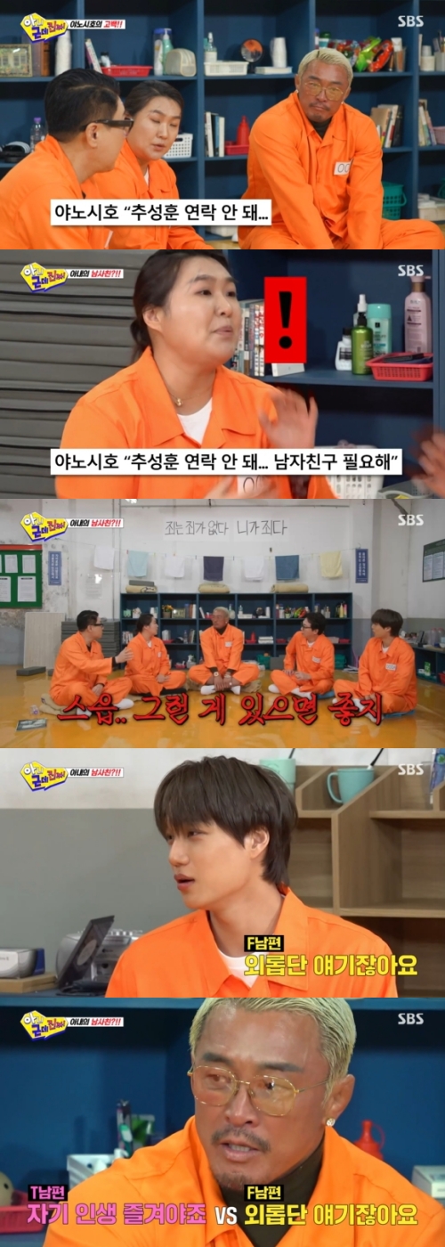 이상민은 "지금 밖에서 제보가 왔는데 야노시호가 '추성훈이 너무 바쁘다. 난 남자친구가 필요하다'고 했다"며 아내의 발언을 전했다. 추성훈 "그런 게 있으면 좋지. 그런 친구가 있어야 와이프도 재밌다"며 쿨하게 반응했다.