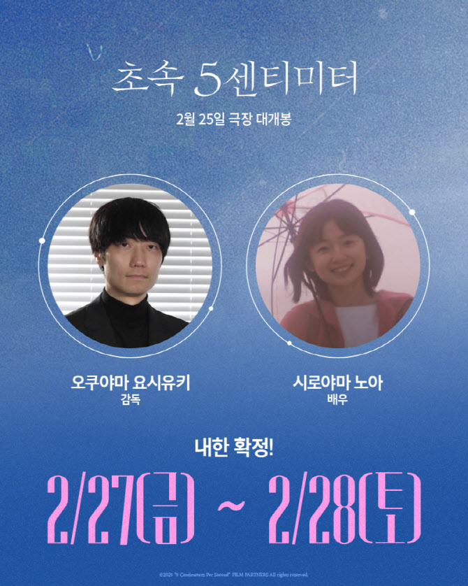 ‘초속 5센티미터’를 연출한 오쿠야마 요시유키 감독은 촉망받는 사진가로 활동하며 포카리스웨트 CM을 비롯해 비롯해 요네즈 켄시, 호시노 겐의 뮤직비디오를 연출하는 등 다방면으로 재능을 펼쳐 온 크리에이터. ‘엣 더 벤치’를 통해 영화 감독으로 데뷔한 후, ‘초속 5센티미터’로 두 번째 장편을 연출하며 실력을 인정받았다. 오쿠야마 요시유키 감독은 지난해 부산국제영화제를 통해 ‘초속 5센티미터’로 관객과 만난 후, 한국 개봉에 맞춰 다시 한번 한국 극장을 찾는다. 이번 내한에 함께하는 배우 시로야마 노아는 일본 영화사 도호 예능이 주최한 ‘도호 신데렐라 오디션’에서 10세의 나이로 사상 최연소 그랑프리에 선정된 이력이 있는 아역 배우로, 현재 일본에서 가장 사랑받는 ‘국민 여동생’이다. ‘초속 5센티미터’에서 500 대 1의 경쟁률을 뚫고 어린 아카리 역으로 발탁되어 밝고 사랑스러운 매력을 뽐낸 시로야마 노아는 이를 통해 일본 아카데미상 신인배우상 우수상을 확정했을 뿐만 아니라, 현재 올해 최연소의 나이로 신인배우상 최우수상 후보에 올라 뜨거운 관심을 받고 있다. 이처럼 현재 일본 영화계에서 가장 주목하는 오쿠야마 요시유키 감독과 라이징 스타 시로야마 노아가 개봉주 주말에 맞춰 ‘초속 5센티미터’의 홍보 차 한국을 방문하는 바, 무대인사를 비롯해 관객과의 대화 등 다양한 활동으로 한국 관객과 만날 예정이다. ‘초속 5센티미터’의 감독 및 배우가 참석하는 내한 행사에 관한 자세한 내용은 추후 각 극장 홈페이지와 미디어캐슬 사회관계망서비스(SNS)에서 확인할 수 있다.