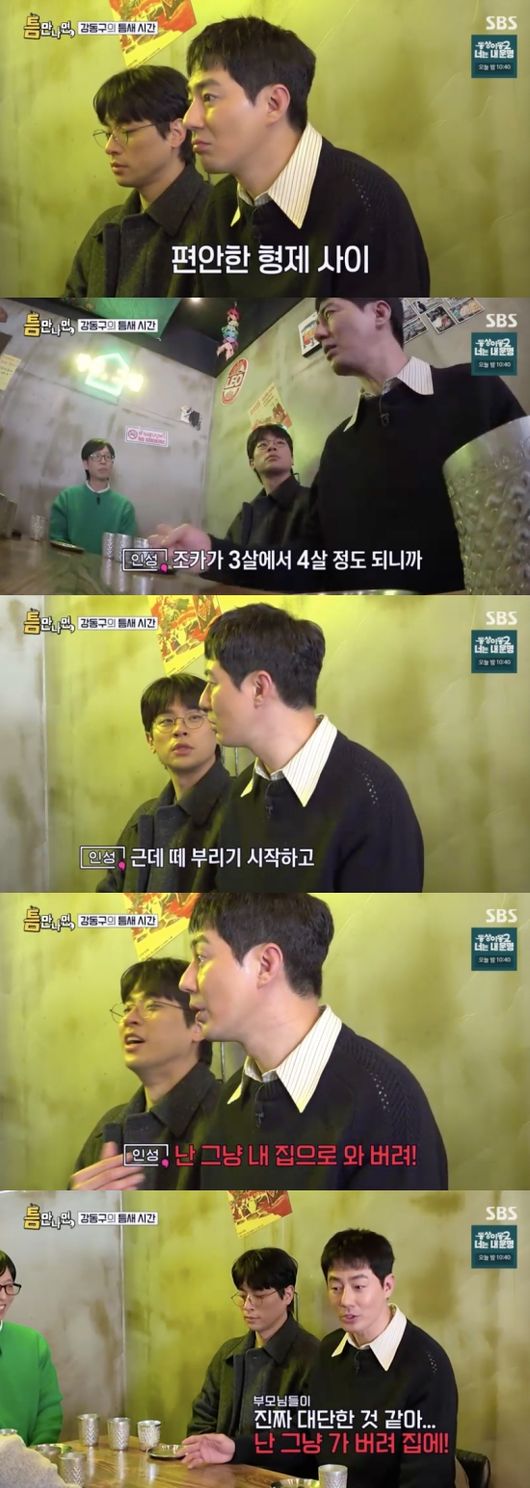 조인성은 “강동구에서 초, 중, 고등학교 나오고 ‘비열한 거리’ 때까지 살았다. 현재는 송파 방이동으로 이사 가서 방이동 독거노인이다”라고 말했다. 이를 듣던 박정민은 “강동에 사신 자부심이 있다. 너무 심하다”라고 말했다.