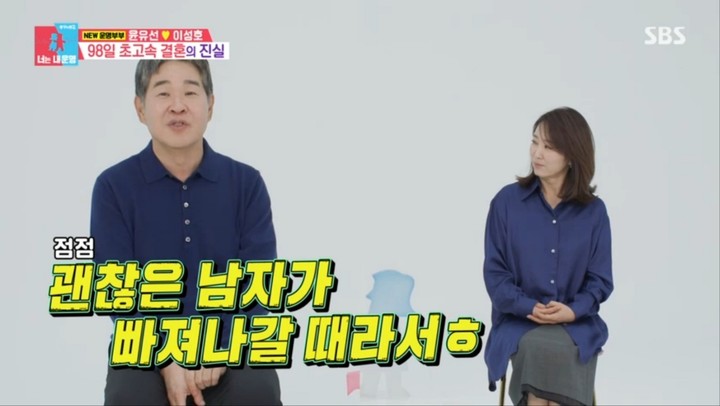 제작진이 윤유선에게 속마음을 묻자 "그게 뭐가 중요해요"라고 담담하게 답했다. 옆에 있던 이성호는 끝까지 "아내가 저한테 되게 고마워해요"라고 주장을 굽히지 않아 웃음을 자아냈다.