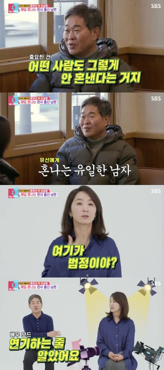이성호는 “결혼하고 이렇게 혼날 줄은 몰랐다. 중요한 건 어떤 사람도 그렇게 안 혼낸다. 나만 혼난다. 나는 진짜 운이 없다. 착한 윤유선한테 혼난 유일한 사람이 나다”라고 귀엽게 토로했다. 이성호는 혼난 적이 너무 많다고 말했고 윤유선은 “저희 엄청 싸웠다. 입장이 다른데 남편은 판결하듯이 잘잘못을 가린다. 처음에는 ‘여기가 법정이야? 왜 잘잘못을 가려’ 했다. 그다음부턴 그렇게 안 한다”라고 말했다.
